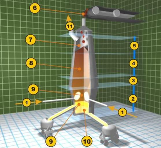 Keywords: WielkiPiec.JPG Blast furnace diagram<br />1 Hot blast from Cowper stoves <br />2 Melting zone<br />3 Reduction zone of ferrous oxide<br /> 4 Reduction zone of ferric oxide<br /> 5 Pre-heating zone<br />6 Feed of ore limestone and coke<br /> 7 Exhaust gases<br /> 8 Column of ore coke and limestone<br /> 9 Removal of slag<br /> 10 Tapping of molten pig iron<br /> 11 Collection of waste gases http //commons wikimedia org/wiki/ Image VysokaPec jpg 2008-09-06 Robert Blazek Pezinok Slovakia cs Wikipedia Robert Blazek Pezinok Slovakia Blast furnaces |