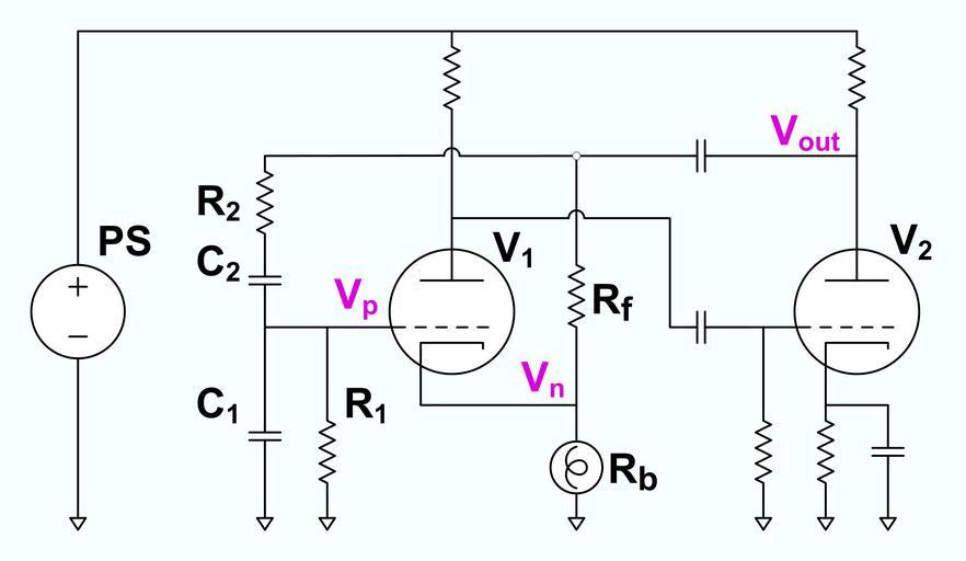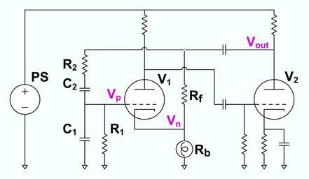 | Keywords: Wien bridge oscillator schematic from Hewletts US patent.png en Simplified schematic of a Wien bridge oscillator from Hewlett ™s US patent 2 268 873 Unmarked capacitors have enough capacitance to be considered short circuits at signal frequency Unmarked resisters are considered to be appropriate values for biasing and loading the vacuum tubes Node labels and reference designators in this figure are not the same as used in the patent 2015-09-19 own Constant314 other versions cc-zero Uploaded with UploadWizard Electronics Electronic oscillators |