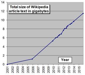 | Keywords: Wikipedia article size in gigabytes.png graph size of Wikipedia measured in size of total article text in English Wikipedia in gigabytes GB compressed own based on en Wikipedia Database download Jan 2001; 0 0 GB Nov 2005; 1 2 GB Nov 2009; 5 3 GB Jun 2010; 6 0 GB Oct 2010; 6 2 GB Jan 2011; 6 5 GB Mar 2011; 6 7 GB Jul 2011; 6 9 GB Dec 2011; 7 7 GB Mar 2012; 8 1 GB Jul 2012; 8 2 GB Aug 2012; 8 5 GB Oct 2012; 8 7 GB Apr 2013; 9 1 GB Oct 2015; 11 5 GB Original excel file can be downloaded from https //docs google com/open id 0B8IdyPbSsy9rWlJDcGlCVUlBODA here Mikael Häggström Originally 2010-07-04 English Wikipedia statistics Line charts Gigabyte |