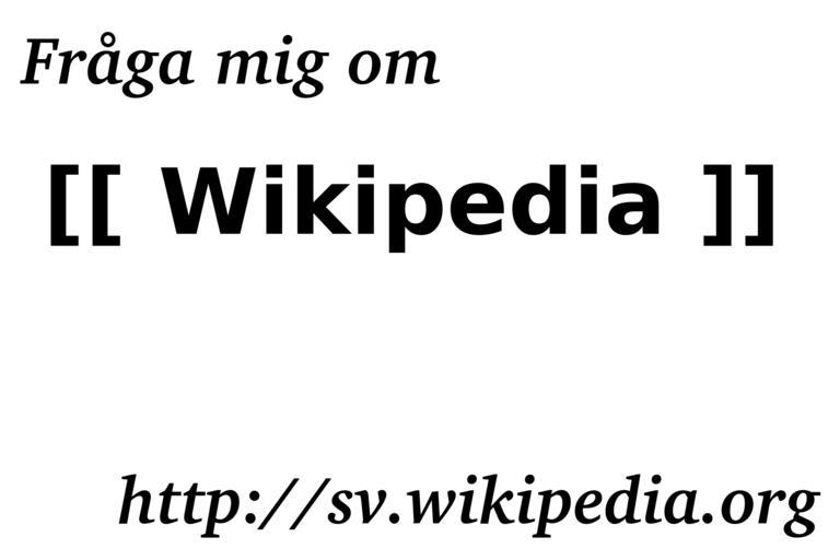 | Keywords: Wikipedia-askme-sv.png Proposed text layout for back side of Swedish Wikipedia t-shirt 2400x1600 PNG black text with transparent background The text says Ask me about Wikipedia in Swedish and the URL Made with GIMP using the fonts Bitstream Vera Sans Bold Non-Rotated 260 px and Bitstream Charter Bold Italic Non-Rotated 192 px This design was inspired by one of the German t-shirts The proposed front of the same t-shirt is image wikipedia-logo-sv-large png Own LA2 Swedish Wikipedia Wikipedia T-shirt drawings without the logo MediaWiki brackets |