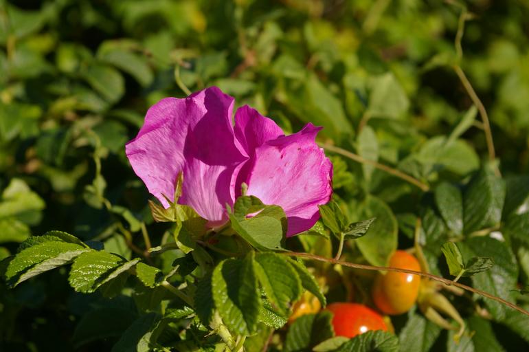 Keywords: wild rose baby rose potato rose rose hip garden bush nature plant pink red flower blossom bloom green park sunshine bud rose summer close bloom flora prickly rose family bed garden rose