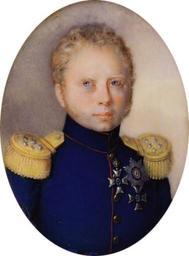 Keywords: Wilhelm I von Württemberg by Johann Michael Holder.jpg Artwork en King William I of Württemberg 1781-1864 in blue uniform with red piping and gold epaulettes wearing the cross of the Royal Württembergian Order of Frederick founded 1830 the badge of the Royal Württembergian Order of Military Merit and one other badge; sky background < 1861 miniature ivory unknown Christie's online 5160988 other versions PD-old-100 Johann Michael Holder 19th-century portrait paintings location missing 1830c William I of Württemberg 1830c 19th-century portrait paintings not categorised by year Male 19th-century oval portrait miniatures of men at bust length 1830c 19th-century portraits in military uniforms 1830c Badges of chivalric orders in portrait paintings 1830c Blue clothing in art male 1830c Paintings on ivory Stars of chivalric orders in portrait paintings 1830c |