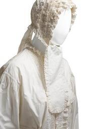 Keywords: Wilhelmina von Hallwyls bruddräkt, detalj - Hallwylska museet - 90098.tif BRUDDRÄKT jämte sexton lösa föremål Bestående av klänning slöja krona krans och bukett näsduk strumpor strumpeband skor linne snörliv kalsonger nattröja nattmössa morgonmössa och tofflor Klänning Liv och kjol samt fyra lösa bandlängder till rosett Av vit sidenmoiré moiré antique med handknuten garnering av gulvitt silke Hand- och maskinsydd Liv Högt bestående av två framstycken två sidostycken och ett ryggstycke alla sneddade Knäppning framtill med kulformiga vita snörmakeriknappar samt knapphål nedanför dessa hakar och hyskor av vit metall isydda med kaststygn under en kantslå av vitt siden Ärmar halvlånga nedre kanten rak Liv och ärmar fodrade med vitt glansigt bomullstyg s k kambrik I sömmarna stöd av valfiskben Kjol Bestående av åtta raka våder baktill ett fållat sprund samt i högra framsömmen en avlång ficka av tyg som livfodret sömmarna maskinsydda Mått Liv längd omkring 41 cm ; bröstvidd omkring 50 cm ; halsvidd omkring 37 cm ; midjevidd omkring 54 cm Ärmar längd omkring 54 cm ; vidd omkring 32 cm Holkar längd omkring 18 cm ; vidd omkring 26 cm Bårder bredd omkring 4 6 5 och 7 cm Tofs längd omkring 5 5 cm Frans längd omkring 3 5 och 8 cm Kjol längd fram omkring 1 16 m ; bak omkring 1 77 m ; vidd omkring 5 48 m Linning längd omkring 64 cm ; bredd omkring 3 cm <br/><br/>Bandlängder <br/>Av vit sidenrips med satinkanter de två korta till öglor de två långa till ändar de senare på vardera ytterändan med garnering som på livet <br/><br/>Mått <br/>Längd 0 41 och 1 36 m ; bredd 18 cm<br/><br/>Anm <br/>Rosetten troligen från en senare modellförändring <br/><br/>Slöja <br/>Av vit silkestyll Rektangulär i två olika stora stycken <br/><br/>Mått <br/>Stora stycket längd omkring 2 32 m ; bredd omkring 1 65 m <br/>Lilla stycket längd omkring 1 68 m ; bredd omkring 1 56 m<br/><br/>Krona <br/>Rund Stommen bestående av åtta radiella byglar av mörk karkas nedtill fästa vid en horisontell liggande ring byglarnas övre ändar sammanlöpande upptill i mitten till en nedåtvänd kort spets samt virade med tätt sittande myrtenkvistar <br/><br/>Krans <br/>Med stomme som kronan samt omvirad med myrtenkvistar <br/><br/>Bukett <br/>Av myrten med rester av vita liljor <br/>Dessutom fragment av en liten bukett bestående av en ros samt gullborste Linosyris vulgaris eller Aster linosyris; användes på 1800-talet och ännu i början av 1900- talet som grönt i buketter o d <br/><br/>Näsduk <br/>Av vit linnebatist med bred vit spets application de Bruxelles <br/>Kvadratisk handsydd <br/>Spetsen knypplad samt sydd på maskinvävd tyll <br/>Spetsen fastsydd med efterstygn av vit tvåtrådig linnetråd vid ett mittstycke av vit linnebatist <br/><br/>Mått <br/>Sidlängd omkring 43 cm <br/><br/>Strumpor ett par <br/>Av vitt silke vävda <br/>På vardera smalbenets utsida en tät rand upptill med axliknande avslutning samt nedtill tvådelad med en lång rand på foten och en kortare på hälen <br/>Upptill en bred fåll på utsidan med två par parallella smala ljusröda ränder <br/><br/>Mått <br/>Längd omkring 79 cm ; vidd omkring 22 5 cm <br/><br/>Strumpeband ett par <br/>Handsydda Av ljust rödgredelint sidentaftband varpå pålagt ett mittparti av vitt sidentaftband med stadkanterna omvikta och fastsydda med fållstygn av ljust rödgredelint silke <br/>Bandens ändar trubbvinkligt urklippta <br/><br/>Mått <br/>Längd omkring 1 m ; mittparti längd 25 cm <br/>Band bredd omkring 2 5 cm <br/><br/>Skor sedermera s k pumps ett par <br/>Av vit sidenatlas <br/>Hand- och vändsydda <br/>På vardera sidan på mitten två snett tvärgående efterstygnssömmar s k sidosömmar av vitt silke <br/>Knytband av vita smala tvåskaftade sidentaftband <br/>Bakstycket fodrat med vitt getskinn framstycket med vitt tvåskaftat linnetyg <br/>Sula av tunt ljusbrunt läder med tvärskuren tå Fodersula av vitt getskinn <br/>Klack av trä halvhög svagt insvängd klädd med vit sidenatlas samt med ytterlapp av ljusbrunt läder fäst med sex stift av mässing <br/><br/>Mått <br/>Längd omkring 24 cm ; bredd omkring 6 2 cm<br/>Klack höjd omkring 3 cm <br/>Knytband längd omkring 52 cm ; bredd 0 8 cm <br/><br/>Linne <br/>Av vitt tvåskaftat linnetyg samt med broderier <br/>Hand- och maskinsytt <br/>Fram- och bakstycke sneddade samt hopsydda med fällsömmar <br/>Ärmhålen starkt sneddade uppåt ärmarna korta med kilar <br/>Halsurringningen svagt rundad samt tätt rynkad <br/>Alla sömmar sydda med fin vit bomullstråd <br/><br/>Mått <br/>Längd omkring 1 07 m ; vidd nedtill 1 8 m <br/>Ärmar längd omkring 7 8 cm ; vidd omkring 36 cm <br/>Halslinning längd omkring 93 cm ; bredd omkring 0 8 cm <br/><br/>Snörliv <br/>Av vitt fyrskaftat bomullstyg och vitt tvåskaftat linnetyg <br/>Handsytt <br/>Två symmetriska sneddade stycken hopsydda framtill i mitten och bildande en lång spets Nedtill på vardera sidan om denna fyra kilar en tresidig och tre fyrsidiga upptill två starkt sneddade tresidiga kilar Mellan kilarna ett stöd av valfiskben utanför bortre kilen sex dylika stöd <br/>Sömmarna sydda dels med vitt silke dels med vit bomullstråd <br/><br/>Mått <br/>Höjd fram omkring 35 5 cm ; bak omkring 35 cm <br/>Midjevidd omkring 46 cm <br/><br/>Kalsonger s k öppna ett par <br/>Av vitt smalrandigt fyrskaftat bomullstyg samt med broderi <br/>Handsydda och handbroderade <br/>Bestående av två fram- och baktill sneddade stycken på framsidan hopsydda ett stycke upptill med fällsöm <br/>Alla sömmar sydda med vit fin bomullstråd <br/>Mått <br/>Längd omkring 84 cm ; linning längd omkring 94 cm <br/>Ben vidd nedtill omkring 56 cm ; band längd omkring 83 cm <br/><br/>Underkjol <br/>Av vitt tvåskaftat bomullstyg samt med broderi <br/>Hand- och maskinsydd <br/>Bestående av fem raka våder upptill tätt rynkad runtomkring samt fastsydd med fållstygn vid en sneddad linn