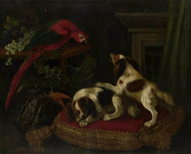 View Original:Willem Gabron (Attr.) - Still life with macaws and two King Charles spaniels.jpg (1100x886)
