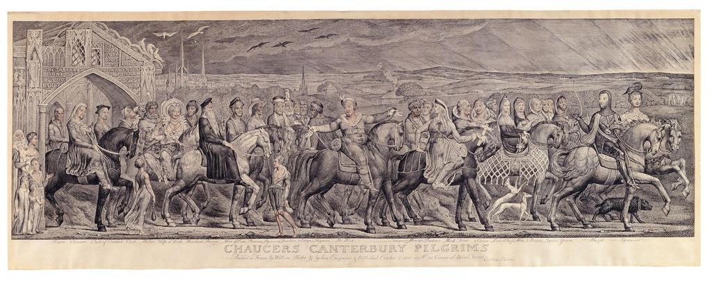 | Keywords: William Blake - Chaucer's Canterbury Pilgrims.jpg en Chaucer's Canterbury Pilgrims Copper engraving by William Blake with additions in watercolour by the artist Third state 1810 “20 In the collection of the Morgan Library Chaucer's Canterbury Pilgrims Copper engraving with additions in watercolor by the artist Signature and imprint Painted in Fresco by William Blake by him Engraved Published October 8 1810 at No 28 Corner of Broad Street Golden Square; inscribed below Chaucers Canterbury Pilgrims and with the names of the pilgrims Reeve Chaucer Clerk of Oxenford Cook Miller Wife of Bath Merchant Parson Man of Law Plowman Physician Franklin 2 Citizens Shipman The Host Sompnour Manciple Pardoner Monk Friar a Citizen Lady Abbess Nun 3 Priests Squires Yeoman Knight Squire This is a magnificent example of Blake's largest print one of only three known impressions to which he added watercolor The engraving is known in five states and the present sheet is the only hand-colored example of the third state of the image Blake's use of line engraving emulating the styles of early printmakers Albrecht Dürer and Lucas van Leyden evokes the character of Chaucer's poetry Blake painted the pilgrims after a quarrel with R H Cromek and Thomas Stothard regarding whether the commission had originally been Blake's The painting was exhibited at his brother's Soho shop in 1809 and this engraving was created from it http //www themorgan org/collections/works/blake/work asp id onDisplay page 5 creator William Blake 1810-20 thumb left 5th state printed c 1820-23 PD-old-100 William Blake's engravings William Blake Geoffrey Chaucer Canterbury Tales William Blake's Chaucer |