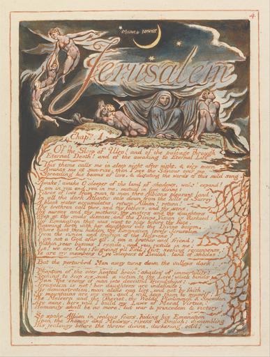| Keywords: William Blake - Jerusalem, Plate 4, "Jerusalem , Chap. 1...." - Google Art Project.jpg print orange pen ink black watercolor paper cream Relief etching printed in orange with pen and black ink and watercolor on moderately thick smooth cream wove paper London 1757 London 1827 William male 2369124 Blake British 1757 - 1827 /collection/yale-center-for-british-art/artwork/jerusalem-plate-4-jerusalem-chap-1-william-blake/2382266/ William Blake Artist /artist/william-blake/4130035/ 4130035 /collection/yale-center-for-british-art/ Yale Center for British Art 2305845 http //britishart yale edu/ 2/23/2012 9 46 47 PM /collection/yale-center-for-british-art/artwork/jerusalem-plate-4-jerusalem-chap-1-william-blake/2382266/ 1804 1804 to 1820 moon women sky night stars men wings text nudes historical subject Relief etching printed in orange with pen and black ink and watercolor on moderately thick smooth cream wove paper 225 2382266 False 1820 3/24/2012 4 10 36 PM YCBA/lido-TMS-3470 http //collections britishart yale edu/vufind/Record/1667756 Yale Center for British Art Paul Mellon Collection print 1800 1830 Felpham Creation w162 x h225 cm 1804 to 1820 False 0 755859375 Item jerusalem-plate-4-jerusalem-chap-1-william-blake Jerusalem Plate 4 Jerusalem / Chap 1 j 162 No inscription Inscription _Signed_and_Dated Not signed not dated Not on View Relief etching printed in orange with pen and black ink and watercolor on moderately thick smooth cream wove paper moon women sky night stars men wings text nudes historical subject special url_id kwEnX7pvjjCT5Q PD-old-100-1923 1827 Jerusalem The Emanation of the Giant Albion - copy E - Google Art Project 004 Google Art Project works by William Blake |