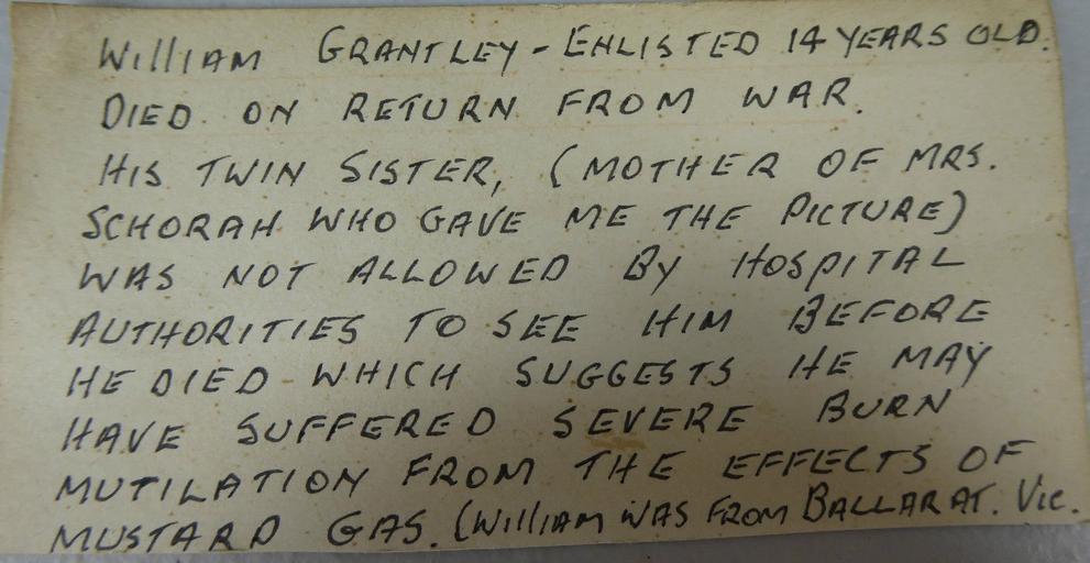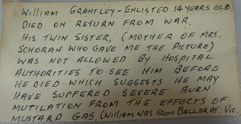 | Keywords: william grantley williamgrantley ww1 kia soldier bugler australia army military ballarat victoria text document writing Written on note: "WILLIAM GRANTLEY - Enlisted 14 years old. Died on return from war. His twin sister, (mother of Mrs Schorah who gave me the picture) was not allowed to see him before he died which suggests he may have suffered severe burn mutilation from the effects of mustard gas. William was from Ballarat. Vic" No person by this name appears in any of the Australian war records. There is a Thomas Frederick Grantly who seems to fit into place given all of the information at hand. His service no. was 1829 and his war records are here: www.aif.adfa.edu.au/showPerson?pid=116965 (found on ebay) Written on note: "WILLIAM GRANTLEY - Enlisted 14 years old. Died on return from war. His twin sister, (mother of Mrs Schorah who gave me the picture) was not allowed to see him before he died which suggests he may have suffered severe burn mutilation from the effects of mustard gas. William was from Ballarat. Vic" No person by this name appears in any of the Australian war records. There is a Thomas Frederick Grantly who seems to fit into place given all of the information at hand. His service no. was 1829 and his war records are here: www.aif.adfa.edu.au/showPerson?pid=116965 (found on ebay) |