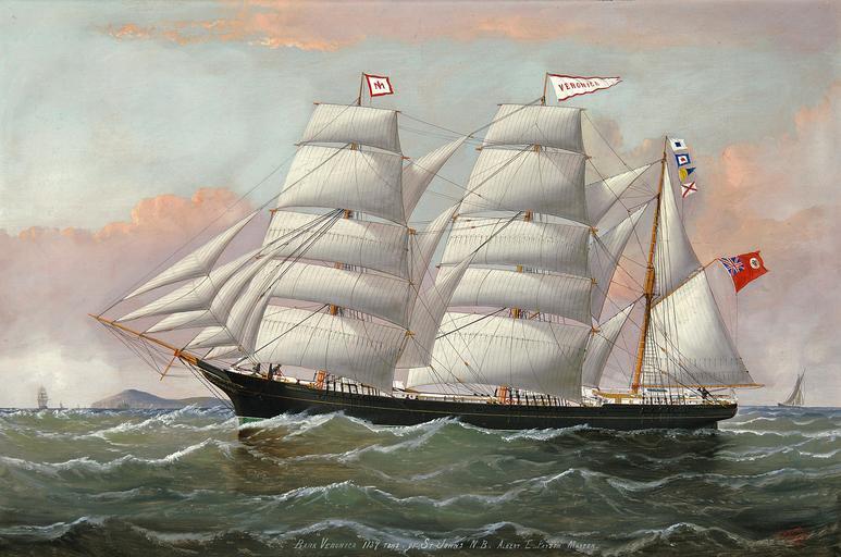 | Keywords: William Howard Yorke - The British bark ‚Veronica‘.jpg Artwork William Howard Yorke 1847-1921 On 11th October 1902 under the command of the elderly and rather deaf Captain Alexander Shaw she sailed out of the Gulf of Mexico bound for Montevideo with a cargo of timber Aboard her were two officers assisting Captain Shaw a cook and eight seamen Some time later the steamer Brunswick picked up the cook and four sailors from one of the ship's lifeboats the survivors claiming that the Veronica had been destroyed by fire During the voyage home to Liverpool however the cook and another crewman separately confessed to killing their captain and the six other persons aboard and then setting the vessel ablaze to hide what was undoubtedly a particularly brutal murder for no apparent reason Once back in Liverpool the five survivors from the Veronica were tried convicted and hanged for what was at the time a sensational and highly publicized crime <ref>http //www bonhams com/auctions/17770/lot/50/ MR14_page_lots 2 MR14_module_instance_reference 14 Bonhams</ref> reflist 1884 oil canvas in 20 30 object history credit line signed inscribed and dated 'W H Yorke/Liverpool/1864' lower right and inscribed 'Bark Veronica 1137 tons of St Johns N B Albert E Payson Master lower center William Howard Yorke painted another similar portrait of Veronica in 1893 currently in the collection of the New Brunswick Museum in St John http //www veronicamutiny se/Veronica jpg here accession number http //www bonhams com/auctions/17770/lot/50/ MR14_page_lots 2 MR14_module_instance_reference 14 Bonhams PD-old-auto-1923 1921 William Howard Yorke Veronica ship 1879 1884 paintings 19th-century sailing ships in paintings Images from Bonhams |