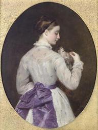 Keywords: William Powell Frith The two doves 1869.jpg The two doves Signed and dated WPFrith 1869 Inscribed on various exhibition labels attached to the reverse Oil on canvas oval 58 5 x 44 5 cm http //www bonhams com/ Bonhams 1869 Creator William Powell Frith PD-old-100 Images from Bonhams William Powell Frith Pigeons in art Paintings of women with birds 1869 paintings Female human backs in art Art with brown background Three-quarter views of females Female hands in art |