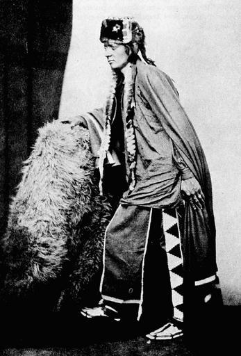 | Keywords: William S. Soule - Shib-O-Nes-Ter.jpg ;Shib-O-Nes-Ter Portait of Shib-O-Nes-Ter Young Man with Fur-Wrapped Braids and Wearing Blanket Fur Hat Quilled Leggings and Moccasins; Animal Skin Nearby 1867-75<ref>National Anthropological Archives Smithsonian Institution http //siris-archives si edu/ipac20/ipac jsp uri full 3100001~ 39177 0 SPC BAE 3912-B Vol 1 01157500</ref> We have no information on this Arapaho dandy which is unfortunate because he does not appear to be an Indian at all But whether he is a white captive or the son of a white Person is not known He seems to have lightcolored eyes and hair and his features especially around the eyes and mouth certainly suggest Caucasian ancestry Nevertheless his dress and trappings and his companions-half-brothers or more likely foster brothers -are definitely Indian Smithsonian Institution Bureau of American Ethnology In Wilbur Sturtevant Nye Plains Indian raiders the final phases of warfare from the Arkansas to the Red River with original photographs by William S Soule University of Oklahoma Press 1st edition 1968 ISBN 0806111755 p334 Wilbur Sturtevant Nye Plains Indian raiders the final phases of warfare from the Arkansas to the Red River with original photographs by William S Soule University of Oklahoma Press 1st edition 1968 ISBN 0806111755 p335 between 1867 1875 Creator William S Soule reflist PD-old-auto-1923 1908 Arapaho Oklahoma in the 1870s William S Soule Male fur headgear Otter clothing Bison clothing Fur fashion in 1871 |