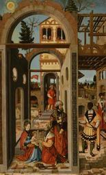 | Keywords: William Stetter - Adoration of the Three Kings - Walters 372619.jpg The wise men who according to the Gospels came from the East to adore the Christ Child and acknowledge his divinity were often depicted as kings underscoring the importance of their homage The star that they followed is in the upper left corner The oldest king a regal European kneels before the Child and his mother The middle-aged Turkish potentate wearing a turban looks back through the doorway in the ruin where the holy family has taken refuge toward the youngest ruler a vigorous young African attired in elegant 16th-century German fashion His facial features are more individualized than those of the other two and it may be that he is based on a study made from life In the distance some of the kings' followers ride horses with very long necks surely the artist's attempt at camels The painter has created a kind of stage set for his drama using a perspective system made popular by his famous fellow countryman Albrecht Dürer The receding lines marked out in the masonry go back more or less to one point the hand of the man in the doorway at center 1526 Early Modern oil on panel Overall cm 87 3 54 ; Framed 37 7/8 x 24 7/16 x 2 3/8 96 2 x 62 07 x 6 03 cm accession number 37 2619 29860 Sara D Redmond Oyster Bay New York by purchase Walters Art Museum Henry Walters Bequest of Sara D Redmond 1985 place of origin Strasbourg Germany Walters Art Museum license 2D William Stetter 1526 paintings Renaissance paintings in the Walters Art Museum 16th-century religious paintings in the United States 16th-century paintings of the Adoration of the Magi 16th-century oil on panel paintings in the United States 1520s paintings in the United States 1520s religious paintings 1520s paintings from Germany |