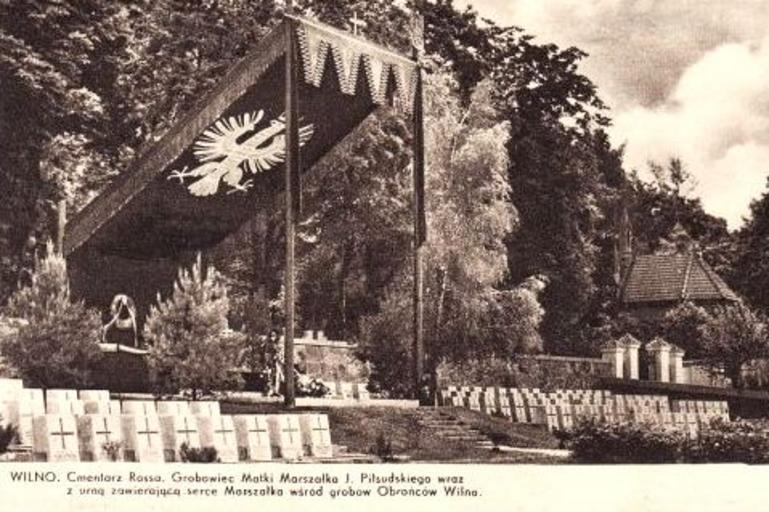 Keywords: Wilno Rossa mausoleum.jpg en Vilno Rossa cemetery pl Wilno cmentarz Na Rossie A postcard Author 1937 Coats of arms of Poland The mother and the heart of son Mausoleum in Rasos Cemetery PD-Polish Anonymous-EU