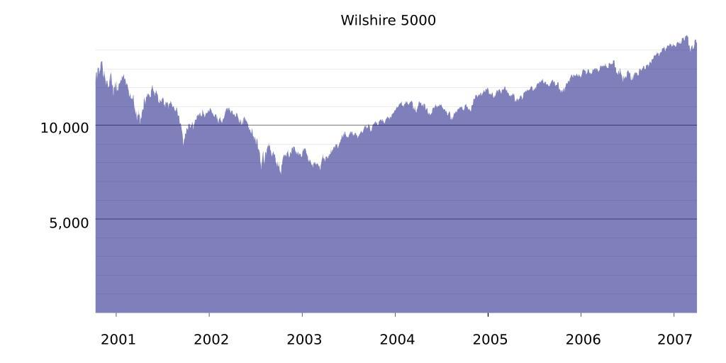 | Keywords: Wilshire 5000 historical graph.svg en wikipedia 2009 April 1 This is the Wilshire 5000 from Oct 11 2000 to Mar 30 2007 with daily closings Source http //www econstats com/eqty/eq_d_na_17 csv en wikipedia Drilnoth CommonsHelper 2007-04-28 Lalala666 wikipedia en Lalala666 Original upload log page en wikipedia Wilshire_5000_historical_graph svg 2007-04-28 16 45 Lalala666 800×400× 45211 bytes <nowiki>This is the Wilshire 5000 from Oct 11 2000 to Mar 30 2007 with daily closings Source http //www econstats com/eqty/eq_d_na_17 csv</nowiki> Category Stock market indexes |