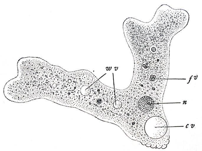 | Keywords: Wilson1900Fig3.jpg Original figure legend Amoeba Proteus an animal v food-vacuole à bersetzung nach der Originalabbildungslegende žAmoeba Proteus ein Tier das nur aus einer einzigen nakten Zelle besteht x280 Aus Sedgwick and Wilson's Biology <br /> n Zellkern nucleus ; w v Wasservakuole; c v kontraktile Vakuole; f v Nahrungsvakuole Amibe telle qu'observée par Wilson au microscope vers 1900 ; Traduction de la légende originale de la figure žAmoeba Proteus ; un animal constitukojphiué d'une seule cellule nue x280 tiré de Sedgwick and Wilson's Biology <br />n Noyau nucleus ; w v Vaculole d'eau; c v Vacuole contractile; f v Vacuole d'aliments Figure 3 of cite book Wilson Edmund B Edmund Beecher Wilson The cell in Development and Inheritance 2 1900 The Macmillan Company New York 1900 Edmund Beecher Wilson 1856 “1939 PD-old-70-1923 Cell diagrams Amoeba proteus |