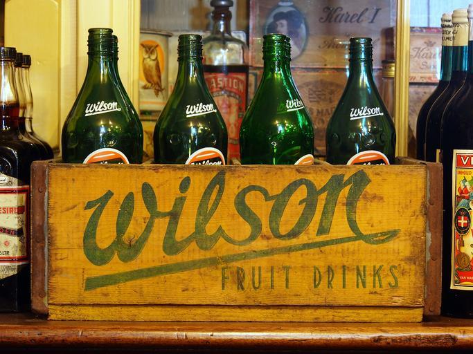 | Keywords: Wilson Fruit drinks crate with empty bottles, pic1.JPG Photographed at the Museum in den Halven Maen The Netherlands Photo of a very old product that is not produced and not sold anymore own 2014-08-03 12 35 34 Alf van Beem CC-zero Trademarked Museum in den Halven Maen Wooden containers |