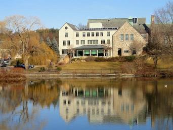Keywords: winchester massachusetts library building scenic architecture trees sky clouds lake water reflections nature outside