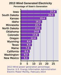 Keywords: Wind Generation Percentage Bar Chart U.S. 2013.svg en Bar chart of percentage of electricity generation by wind power for leading states 2014-04-01 15 16 26 own Aflafla1 Valid SVG Created with Python cc-zero Uploaded with UploadWizard Wind energy statistics of the United States |