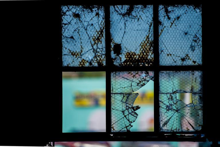 Keywords: window broken glass destruction old shattered crack vandalism damaged abandoned shards demolished industrial deteriorated damage