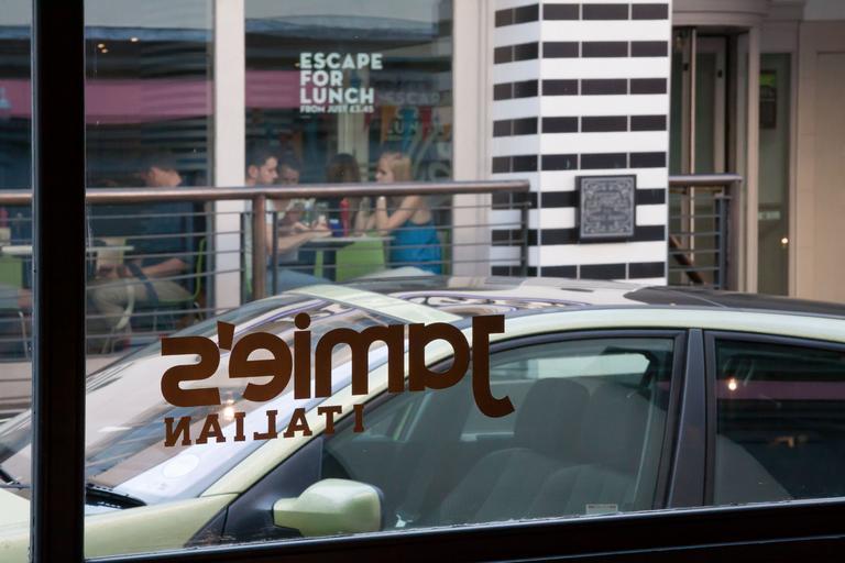 Keywords: window caption lettering mirrored celebrity chef jamie oliver's restaurant italian auto bristol england sitting eat glass front