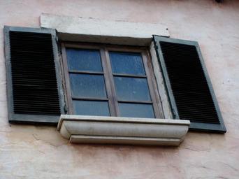 Keywords: window frame shutters glass panes wall shade of pink weathered decorative window sill