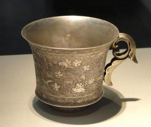 Keywords: Wine cup with ring handle, probably Chang'an, Shaanxi province, China, early Tang dynasty, early 8th century AD, cast and hammered silver with mercury gilding - Freer Gallery of Art - DSC05584.JPG en Exhibit in the Freer Gallery of Art Washington DC USA This artwork is old enough so that it is in the public domain Photography was permitted in the museum without restriction 2013-02-12 15 58 42 own Daderot cc-zero Metalwork of China in the Freer Gallery of Art Uploaded with UploadWizard Metalwork of the Tang Dynasty |