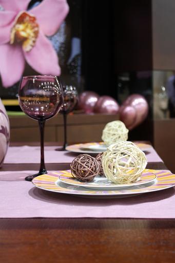 Keywords: wine glasses transparent plates dining table porcelain ceramic violet decoration