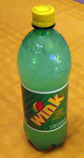 Keywords: Wink Soda.jpg 1-liter bottle of Wink citrus soda on golden background 2005 Own 2005-01-28 Andrew Filer Trademarked Soft drink bottles