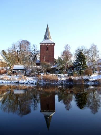 Keywords: winter berkenthin church elbe lübeck canal mirroring reflections water