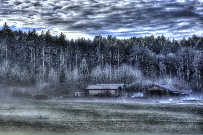Keywords: winter fog landscape cold chiemgau forest trees nature mysterious frosty wintry agriculture meadow hdr cottages wood tractor clouds