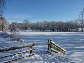 Keywords: winter landscape pond snow ice trees fence away snowy