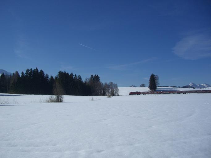 Keywords: winter magic train winter wintry snow trees mountains sky blue lake allgäu railway