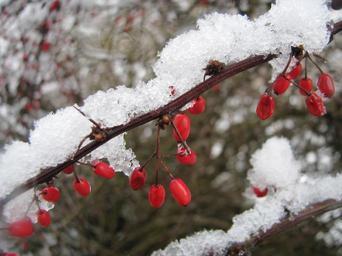 Keywords: winter snow berries red white wintry thorns bush close macro nature