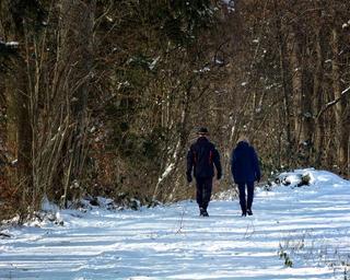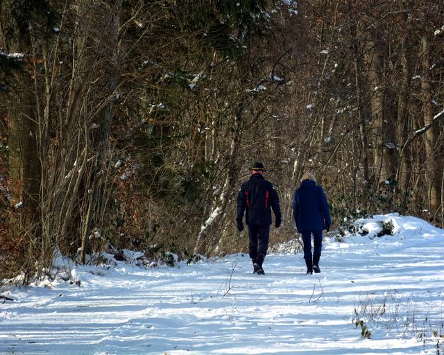 Keywords: winter snow forest away trees personal pair man woman walk go wintry winter forest snowy shrubs nature cold winter mood