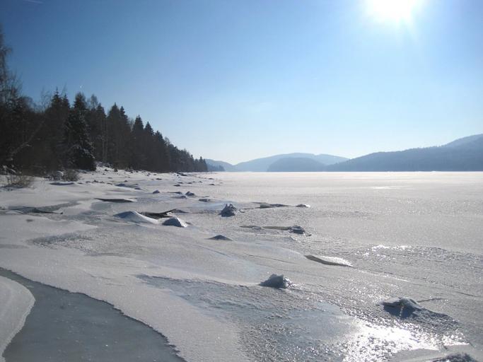 Keywords: landscape winter lake frozen ice snow icy sky sun forest trees nature outside