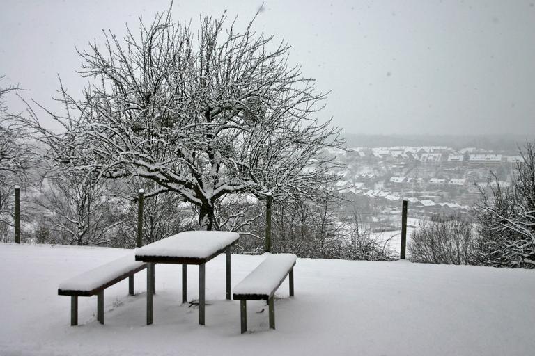 Keywords: winter wintry snow trees table bank more picnic white snowy city view outlook hill leisure hike hiking cold nature picnic table fence village