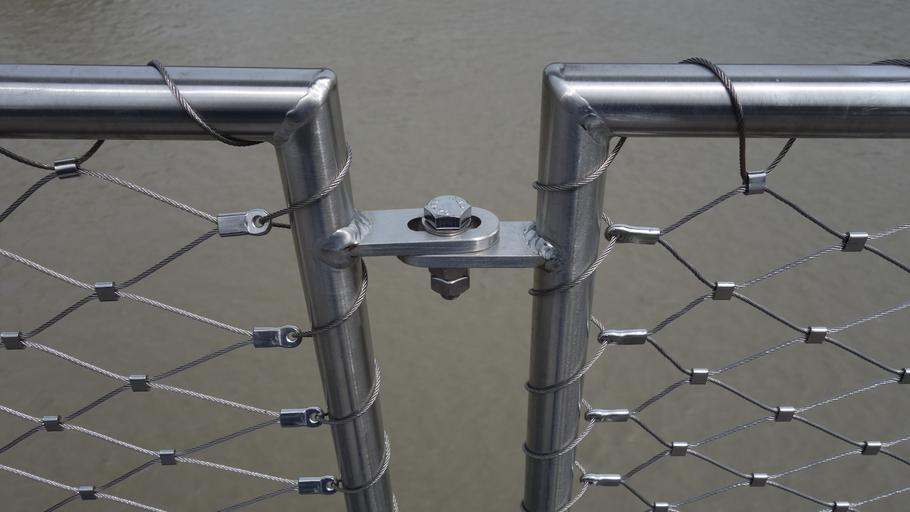 Keywords: wire pipes railing bridge railing regularly pattern metal shiny construction screwed screw bolt connection technology