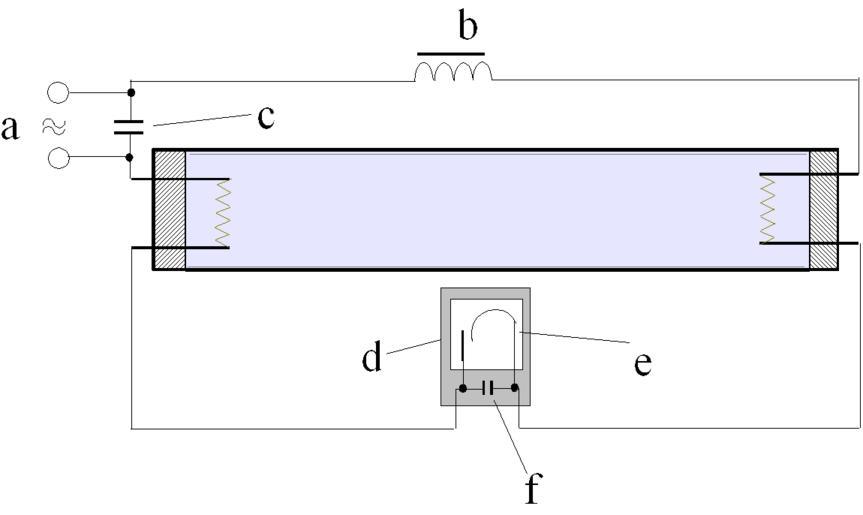 | Keywords: Wiring of fluorescent lamp.gif Wiring of fluorescent lamp a - input b - inductor c - compenzate capacitor d - starter e - bimetal electrode f - capacitor Zapojení zářivky a - vstup b - tlumivka c - kompenzační kondenzátor d - startér e - bimetalová elektroda f - odrušovací kondenzátor own work vlastní dílo 6 8 2007 Check categories 2009 February 7 cs wikipedia Zářivka Compact fluorescent lamp 1 Wiring diagrams of reactive power supplies for fluorescent lamp | ||||