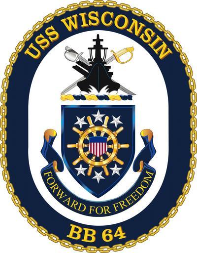 Keywords: Wisconsin crest.jpg Crest of USS Wisconsin BB-64 US Navy via http //www navsource org/archives/01/64a htm Navsource org and http //www tioh hqda pentagon mil/Catalog/Heraldry aspx HeraldryId 14121 CategoryId 8450 grp 5 menu Uniformed 20Services from search tioh hqda pentagon mil Uploaded February 2006 US Navy /Blazon SHIELD Azure Dark Blue a ship's wheel or between an arc of three mullets in chief and an arc of three mullets in base Argent and charged with an escutcheon paly of thirteen Argent and Gules with a chief Azure CREST On a wreath of the colors Or and Azure the silhouette of a battleship affronté of the second upon the waves of the sea Argent in front of a cutlass and a saber points to base saltirewise of the like the saber hilted Gold MOTTO On a scroll Azure doubled Or the motto FORWARD FOR FREEDOM inscribed in Gold letters SEAL The coat of arms emblazoned in full color upon a white oval enclosed by a blue collar edged on the outside with gold chain and bearing the inscription USS WISCONSIN above and BB 64 below in gold letters Symbolism SHIELD Dark blue and gold are the colors traditionally associated with the Navy The ship's wheel represents navigation and leadership and reflects the USS WISCONSIN's global capabilities and seaworthiness The smaller shield from the United States Coat of Arms represents our national heritage and appears on the Wisconsin State flag During World War II the USS WISCONSIN-a virtual floating fort-played a vital part in the establishment of U S naval power as second to none She earned five battle stars for her World War II service and one for her outstanding performance during the Korean War CREST The ship's silhouette is that of a battleship designed to combine the largest guns with the strongest armor in order to inflict and absorb tremendous damage The crossed sword and cutlass represent the combat readiness of the officers and enlisted personnel aboard the USS WISCONSIN PD-USGov USS Wisconsin BB-64 64 number United States Navy battleships emblems |