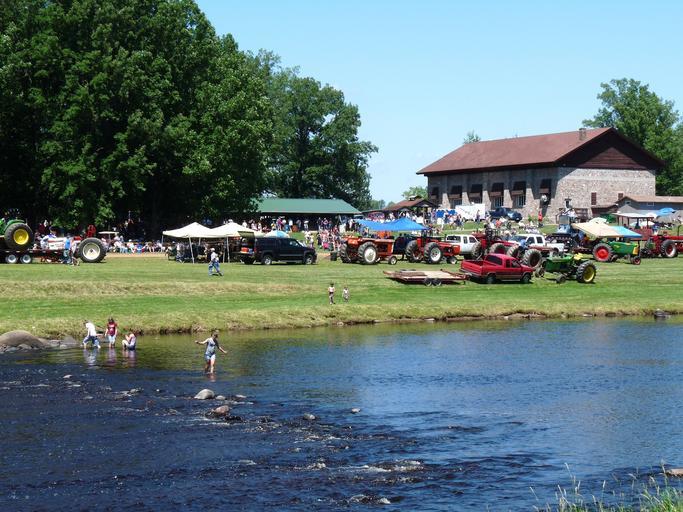 Keywords: wisconsin nature outside stream water shoreline summer vehicles people trees grass tractors even