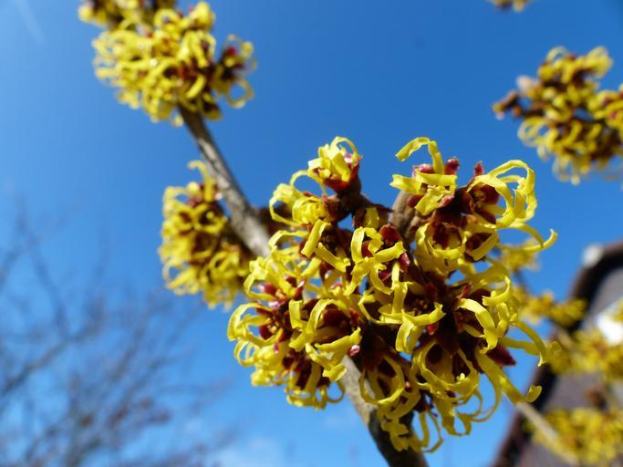 Keywords: witch hazel hamamelis mollis early bloomer flower blossom bloom plant nature yellow sky close yellow flower beautiful