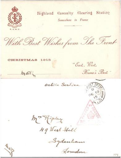 Keywords: christmas public domain publicdomain ww1 nurse ripley nurseripley document text writing drawing sketch I'm finally coming back to Nurse Ripley's postcard album, which I hope to restart posting some time in the New Year. But I couldn't resist sharing this one now. As you can see, this one was sent by Margaret to her mother back in England. I believe that the Highland Casualty Clearing Station was at this time at Aire-sur-la-Lys, although other cards from Margaret around this date suggest she was in or around Amiens. Best Wishes to all my Flickr friends, and here's to some more fun, and lots more mysteries solved, in 2012 I'm finally coming back to Nurse Ripley's postcard album, which I hope to restart posting some time in the New Year. But I couldn't resist sharing this one now. As you can see, this one was sent by Margaret to her mother back in England. I believe that the Highland Casualty Clearing Station was at this time at Aire-sur-la-Lys, although other cards from Margaret around this date suggest she was in or around Amiens. Best Wishes to all my Flickr friends, and here's to some more fun, and lots more mysteries solved, in 2012 |
