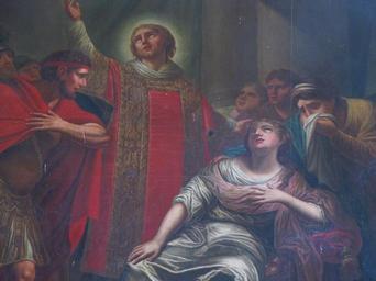 Keywords: Wiwersheim StCyriaque 65.JPG Alsace Bas-Rhin Wiwersheim Eglise St Cyriaque Notre-Dame des Sept-Douleurs Tableau St Cyriaque diacre XVIIIe own 2012 Ralph Hammann cc-by-sa-3 0 Artwork / Œuvre d'art / Kunstwerk Artwork Creator Joseph Melling Saint Cyriaque en habits de diacre exorcisant la fille de l'empereur Dioclétien Arthémia 1787 oil canvas cm 350 200 Eglise Saint Cyriaque Wiwersheim IM67010024 PM67000475 object history Cette toile datée 1787 et signée Joseph Melling proviendrait du maître-autel de l'ancienne église paroissiale dédiée à ce saint et dont le culte fut transféré dans l'édifice actuel en 1888 other versions Ralph Hammann PD-old-100 accession number Interior of Église Saint-Cyriaque de Wiwersheim Photographs of Wiwersheim by Ralph Hammann Taken with Canon PowerShot SX20 IS Objets monuments historiques in Wiwersheim Baroque church paintings in Alsace 18th-century church paintings in Alsace Saint Cyriacus 1787 oil on canvas paintings in France 1787 works in Alsace Objets monuments historiques in Bas-Rhin church paintings