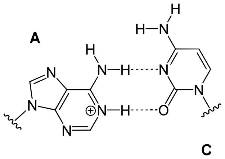Keywords: Wobble base pair AC.svg en Wobble base pair adenine cytosine AC de Wobble Basenpaar Adenine Cytosin AC Own Yikrazuul 5 11 08 DNA chemical structures Base pairing