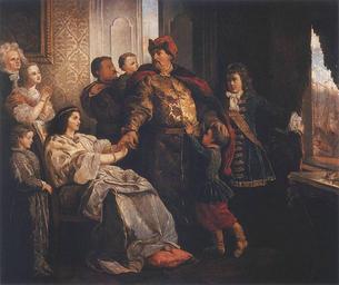 | Keywords: Wojciech Gerson-Pozegnanie Jana III.jpg  Pożegnanie Jana III z rodziną przed wyprawą wiedeńską oil on canvas 169 x 201 cm Masovian Museum Płock http //www pinakoteka zascianek pl/Gerson/Index htm 1882 Wojciech Gerson Copyright expired Creator Wojciech Gerson PD-old-100 John III of Poland Battle of Vienna Families in art Paintings in the Masovian Museum in Płock 19th-century paintings Paintings by Wojciech Gerson Uniform pelisses Fur headgear in art Paintings by Wojciech Gerson with fur Maria Kazimiera Sobieska 17th-century fur fashion |