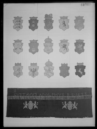 | Keywords: Wolgastantependiet - Livrustkammaren - 68672.tif Antependium av svart sammet med Gustav II Adolfs namn och årtalet 1633 i silver GUSTAVVS ADOLPVS R S 1633 Under texten har sytts fast två längsgående fransar en svart silkesfrans 10 cm bred och över den en guldfrans 12 5 cm bred Antependiet har två i högrelief broderade riksvapen i gult och blått silke hållna av vardera två krönta lejon Vapnen är 56 cm breda och 36 cm höga Avståndet mellan vapnen är 86 cm Antependiet är hopsytt av åtta våder <br/>Det är fodrat med rött ylle och i överkanten är fastsytt ett sjok av linnelärft <br/> se konserveringsrapport 1966 <br/>Antependiet är troligen utfört av Isak Fogeth för sorgehögtiderna i Wolgast <br/><br/>Antependiet omnämns först i 1675 års inv där det beskrivs såhär Ett altarekläde aff Swart Sammet medh Gustaff Adolphi Nampn på Kappan ofwan till gull och Swarta Silckes frantzar nedan till Swarta Frantzar med Twenne Kongl wapen Skiänckt effter konungh Gustaff Adolfphz begrafningh under fodrat medh rödt Sarss A 1633 avskrift ur Sveriges kyrkor Stockholm 1937 s 283 <br/>I inv 1758 står det om antependiet att det börjar väl nu blifva nog fallande dock brukas det alla Fastlags och Advents Tider Antependium of black velvet with Gustavus Adolphus's name and the year 1633 in silver GUSTAVVS ADOLPVS RS 1633 Two longitudinal fringes are sewnnder the text a black silk fringe 10 cm wide and a gold fringe 12 5 cm wide Two coats of arms in high relief embroidered in yellow and blue silk each have two crowned lions as supporters The arms are 56 cm wide and 36 cm high The distance between the arms is 86 cm The antepemndium if made of eight lengths of velver It is lined with red wool and the top edge is sewn with a sheet of linen cloth See conservation report 1966 The antependium was probably made by Isaac Fogeth for mourning ceremonies in Wolgast The antependiet first appeared in the year 1675 where it is described like this A altarekläde aff Swart Velvet with H Gustaff Adolphi Nampn on ofwan to coat wool and Swarta Silckes frantzar below Swarta Frantzar with Twenne Kongl wapen Skiänckt Right after konungh Gustaff Adolfphz begrafningh under lined with H Red is Sarss A 1633 Transcript of the Swedish churches Stockholm 1937 s 283 original caption Wolgastantependiet - LRK 25167 Gustav II Adolfs sorgeprocession i Wolgast 1633 size mm 3440 1150 LRK Westfaliska freden-utställningen place of origin original filename LN_A01868_001868 61704 inventory number LRK 25167 68672 CC0 Wolgastantependiet - Livrustkammaren - 68672-negative tif <gallery caption Different images of same object > File Gustav II Adofs svepkläder Bild tagen i utställningsmontern i rum A med antedendiet i bakgrunden - Livrustkammaren - 49184 tif File Gustav II Adofs svepkläder Bild tagen i utställningsmontern i rum A med antedendiet i bakgrunden - Livrustkammaren - 57745 tif File Wolgast antependium Helbild - Livrustkammaren - 66306 tif </gallery> Funeral of Gustav II Adolf of Sweden Coats of arms to be classified Media contributed by LSH unmatched creator 17th-century antependia Media contributed by LSH 2013-10 |