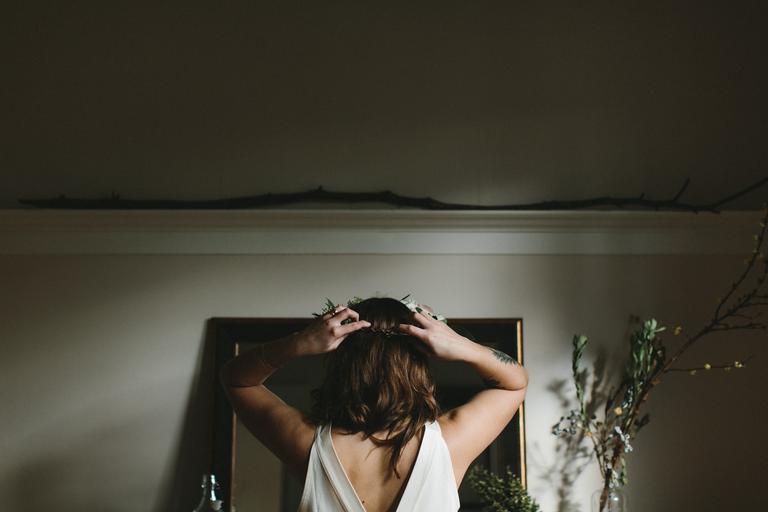 Keywords: woman girl person female putting on flower floral wreath mirror fashion style summer hair back sleeveless shirt