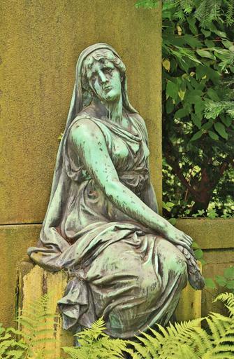Keywords: woman human sculpture statue bronze bronze statue cemetery grave tomb mourning tears emotions sit fate death mood weathered old antique haunting fern stainless discolored aachen ostfriedhof