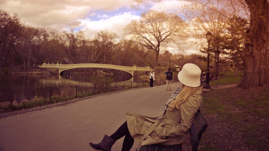 Keywords: woman lady sitting in the park bench bridge water lake new york city new york city manhattan skyline america building travel central park sky landmark cityscape usa blue downtown architecture trees spring cherry tree