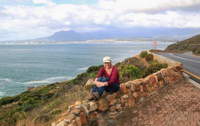 Keywords: woman outlook coast coastal landscape view viewpoint sit wide landscape distant stones rock clouds cloud formations foresight south africa travel wall road holiday cape town views of cape town sea atlantic distant view distance selfie