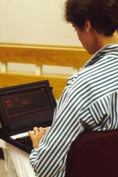 Keywords: Woman sitting with grid computer.jpg A woman is sitting with a grid portable computer in her lap working on PDQ database The view is over her left shoulder Topics/Categories People -- Health Professional Type Color Photo Source National Cancer Institute Bill Branson Photographer 2279 The Web site of the National Cancer Institute http //www cancer gov 1987-06-23 Reuse Restrictions None - This image is in the public domain and can be freely reused Please credit the source and/or author listed above Bill Branson Photographer PD-USGov-HHS-NIH Media from National Cancer Institute Visuals Online Images uploaded by Fæ GRiD Systems Corporation People using computers in the 1980s Striped shirts |